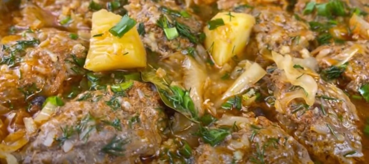 Аромат стоит потрясающий! Сверху можно украсить блюдо рубленной прямо в сковороде или порционно в тарелке. Картофель полностью приготовился и не разварился, рис мягкий, тефтели нежные, как и капуста — вкуснятина! А главное, не нужно долго заморачиваться с готовкой. Приятного аппетита!