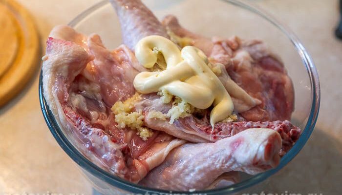 Ингредиенты: · Куриные окорочка – 1 кг. · Репчатый лук – 1 крупная головка · Чеснок – 2 зубчика · Майонез – 4-5 ст.л. · Соль – 1 ч.л. · Перец и хмели-сунели