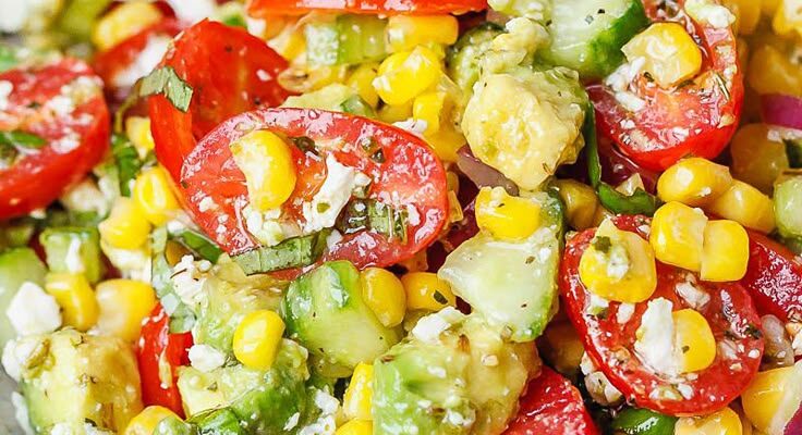 Простой и быстрый рецепт ИНГРЕДИЕНТЫ помидоры черри – 500 г авокадо спелое – 1 шт. кукуруза консервированная – 5 ст.л. лук зелёный – 3 стебля соль перец