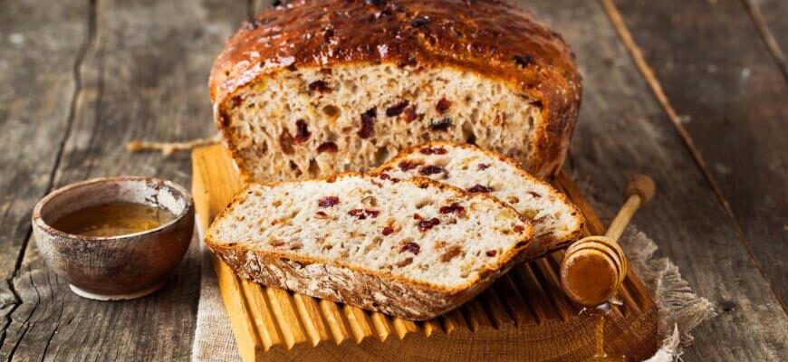 ИНГРЕДИЕНТЫ 3 стакана + 3 ст. л. муки 1/2 ч. л. сухих дрожжей 2 ч. л. соли 1/2 стакана рубленых грецких орехов 1 стакан сушеной клюквы или изюма 1/4 стакана