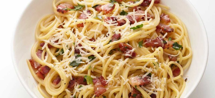 Спагетти карбонара 2 порции 30 мин Ингредиенты: Спагетти — 160 г Панчетта — 120 г Твердый сыр — 50 г Яичный желток —