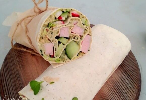 Ингредиенты: — лаваш тонкий — 1 пласт — форель слабосоленая — 100 г — сыр сливочный — 75 г — салат листовой — 15 г Способ приготовления: 1.