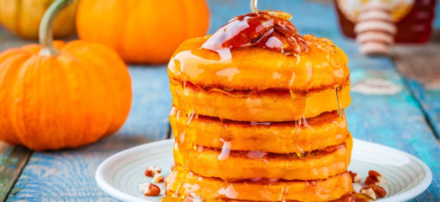 В разгар сезона тыквы можно приготовить не только рагу и супы, но и множество оригинальных десертов. Для тыквенных панкейков понадобятся 300 г тыквенного