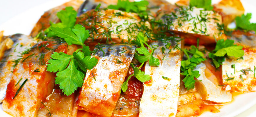 Ароматная, сочная, с очень насыщенным вкусом закуска из скумбрии. Припущенная скумбрия маринуется в пикантном маринаде из солёных огурцов, лука, томатной