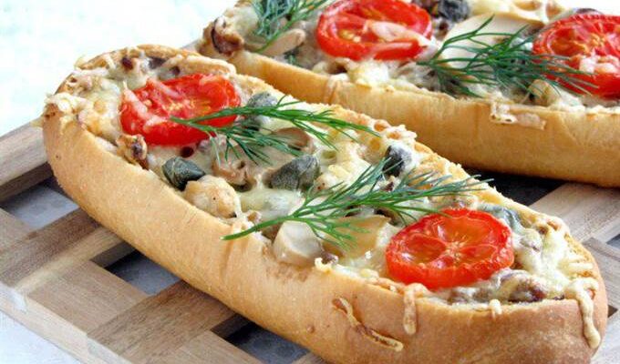 Фаршируем лодочки из багета курицей и грибами и запекаем в духовке. Сочная начинка из курицы с грибами отлично сочетается с хрустящим багетом.