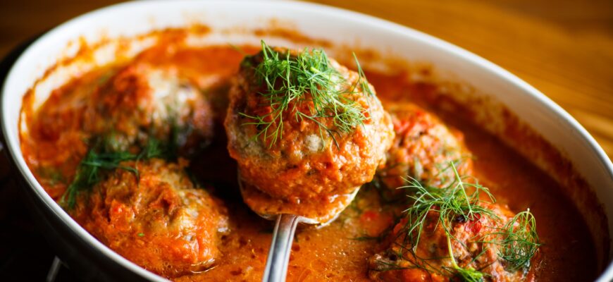 Котлеты с рисом и сладким перцем, запечённые в томатно-сметанном соусе, — простое основное блюдо, которое по вкусу и составу напоминает фаршированный перец.