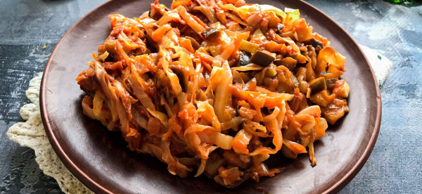 Бюджетный, но очень вкусный летний вариант тушёной капусты. Баклажаны гармонично сочетаются с капустой, в готовом блюде по вкусу они похожи на грибы.