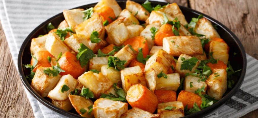 Вкусный и полезный гарнир из доступных продуктов — корень сельдерея, запечённый с морковью. После запекания кусочки корнеплодов получаются очень нежными