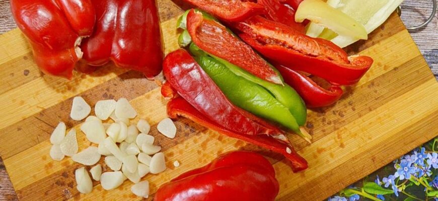 Отличная закуска из запечённого болгарского перца для любого застолья. Сладковатый сочный перец гармонично сочетается с острым перцем, чесноком и свежей зеленью.