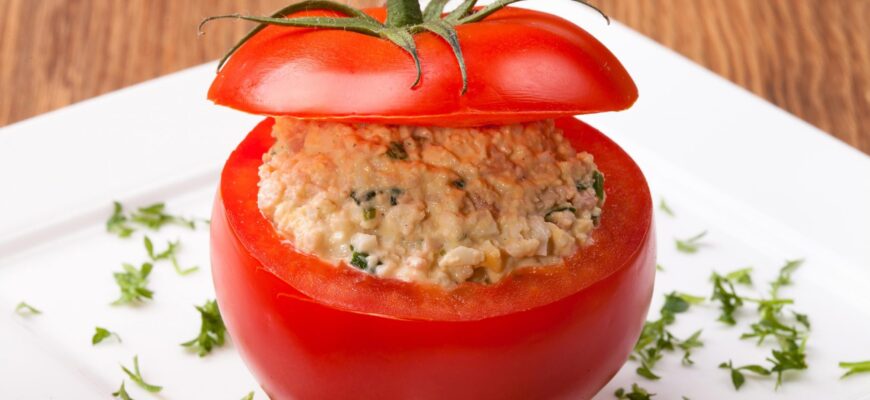 Красивая и сытная горячая закуска для праздничного стола — фаршированные помидоры, запеченные в духовке. По этому рецепту помидоры фаршируют куриной