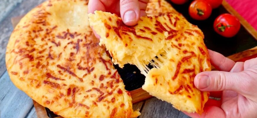 Рецепт: Мука — 260 г Кефир 3.2 % — 200 мл. Соль — 1\2 ч. л. Разрыхлитель — 5 г Сыр сулугуни — 280 г Сыр брынза —