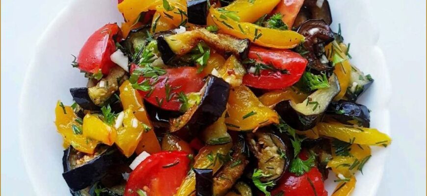 Сочный и ароматный салат из баклажанов по-грузински. Днем сделала большую порцию по этому рецепту, а до вечера его уже не осталось. Ну очень вкусно!