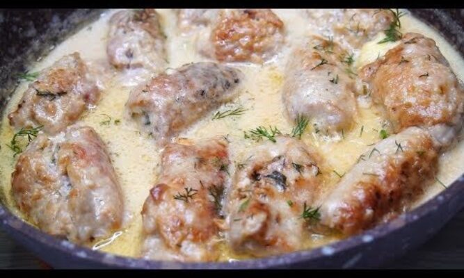 Вкуснейшее горячее блюдо — куриные рулетики в сметанном соусе. По этому рецепту получается мягкая нежнейшая куриная грудка с очень вкусным соусом