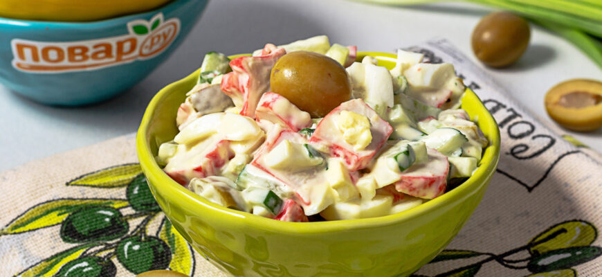 Очень вкусный и нежный крабовый салат с сыром, яйцами и ржаными сухариками обязательно вам понравится, ведь в нем интересно сочетаются крабовые палочки и маслины.