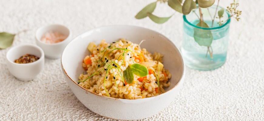 ИНГРЕДИЕНТЫ 250 г перловки 1 большая луковица 2 средние морковки половина небольшого корня сельдерея 4–5 зубчиков чеснока 2–3 веточки тимьяна растительное