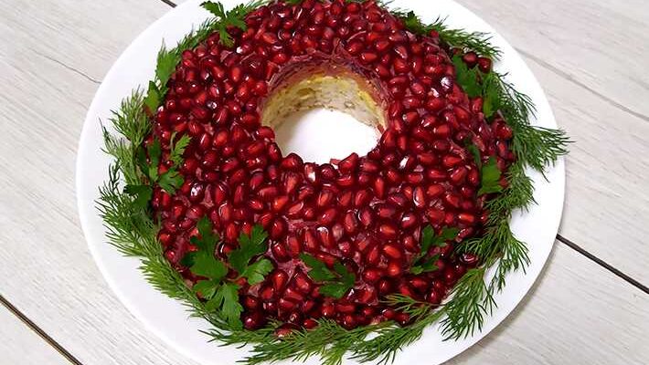 Гранатовый браслет – яркий и необычный салат, который покоряет с первого взгляда. Его изюминкой является соус из гранатового сока, придающий блюду красивый