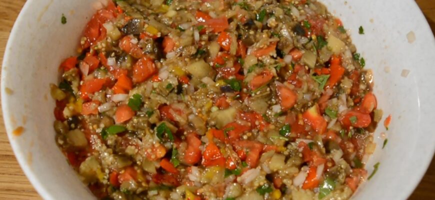 Я в обязательном порядке готовлю эту закуску в баклажанный сезон. Сочный перец, сладкие, мясистые помидоры, молоденькие баклажаны с грядки, любимая зелень