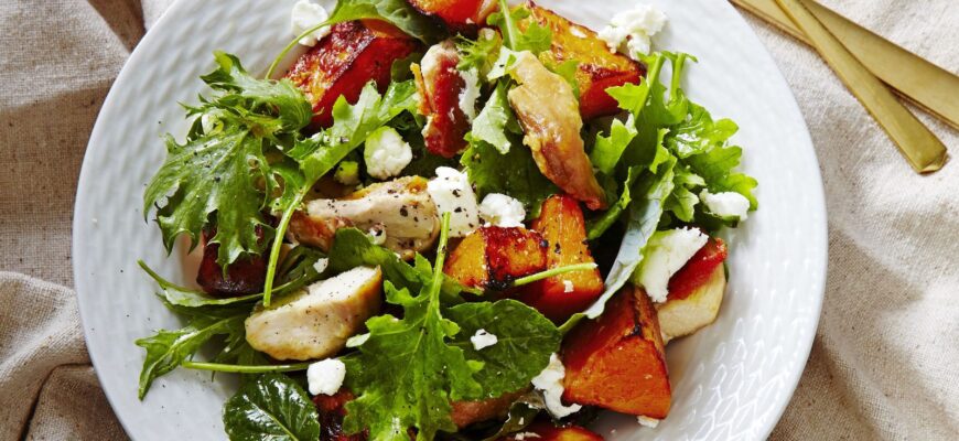 Ингредиенты: 300 г тыквы, нарезанной на кубики 2 груши, нарезанные на тонкие дольки 100 г козьего сыра, порезанного кубиками 50 г грецких орехов, крупно