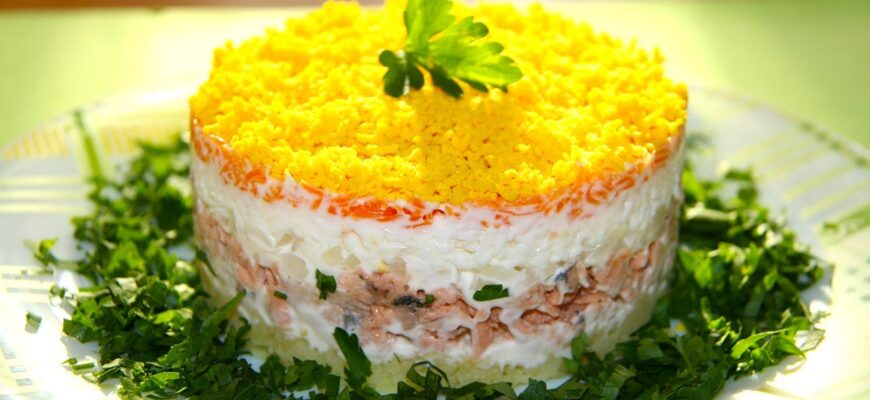 Ингредиенты рыба консервированная – 2 банки; картофель отварной – 5 шт.; морковь вареная – 1 шт.; яйца варёные – 6 шт; лук красный – по вкусу;