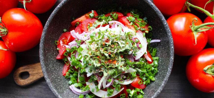 Салат узбекской кухни. Этот салат обязательно подают к плову, полагая, что он не только украсит вкусовую гамму, но и поможет организму расщеплять жиры.