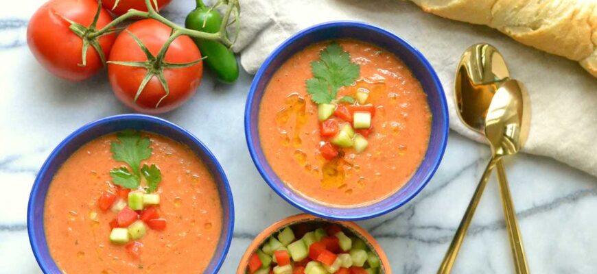 Освежающий, густой и очень необыкновенный суп с помидорами и дыней. Тебе понадобится: 500 г красного и желтого болгарского перца 900 г дыни 800 г помидоров