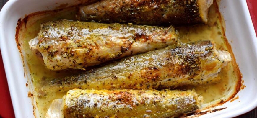 Минтай, запеченный в духовке под вкусным соусом на луковой подушке — один из вариантов приготовления вкусной рыбы в духовке. Используем целые тушки минтая
