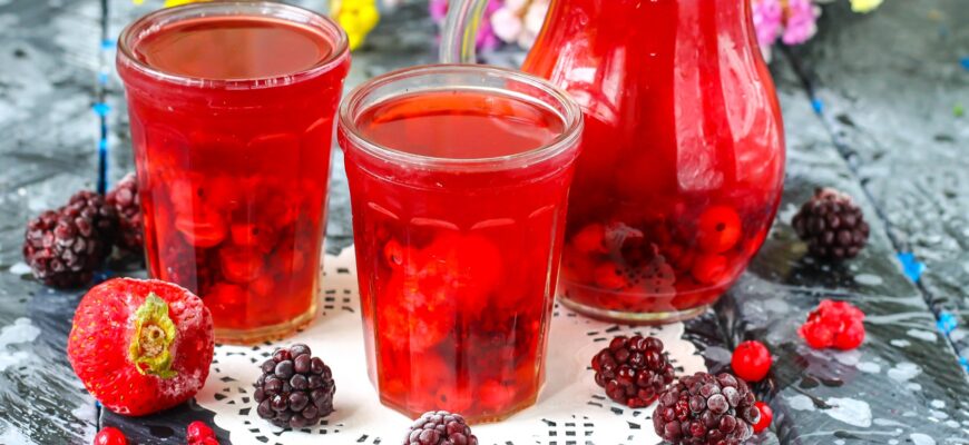 Компот из ягод, которые массово появляются в июне — клубника, малина, смородина — можно сочетать с прошлогодними яблоками и сиропом из ревеня, чтобы сделать