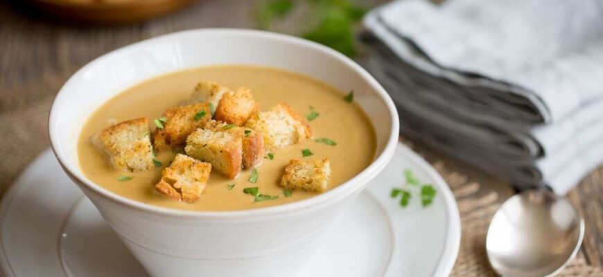 Суп, конечно, можно приготовить и из отварного картофеля, но именно из пюре он получается особенно бархатистым и нежным. Подавать приготовленный суп рекомендуют с сухариками.