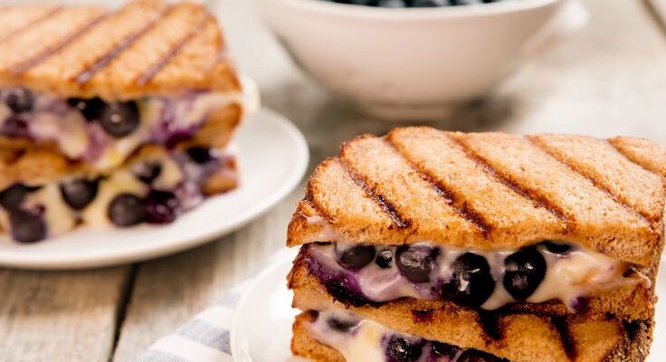Ингредиенты: Масло сливочное — 10 гр Хлеб д/тостов — 4 шт Сыр Камамбер 125 гр Сыр творожный сливочный — 90 гр Джем черничный —