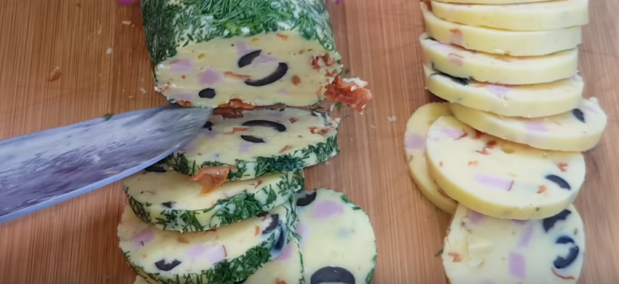 Творожная закуска готовится всего 15 минут и получается вкуснее многих сыров. Все дело в начинке: для нее мы смешаем ветчину и маслины, а саму заготовку
