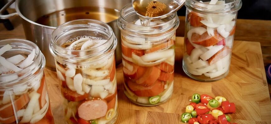 Сосиски и колбаса всегда считались простыми продуктами на утро, или на быстрый перекус. Но если закрыть те же продукты в банках и протомить с луком, как