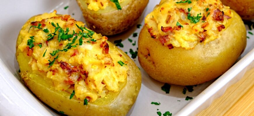 Ингредиенты 6 шт. картофеля 250 гр. ветчины 200 гр. сыра зелёный лук 3 яйца 3 ст.л. сметаны соль специи Пошаговый рецепт приготовления Картофель запечь