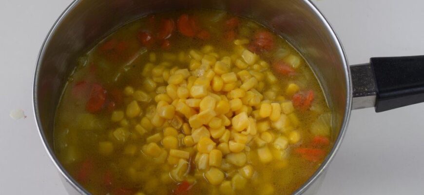 В такой суп можно добавить кубики ветчины или тонко нарезанные ломтики куриной грудки. Кукурузный суп со сладким перцем 4 порции, приготовление: 30 мин.