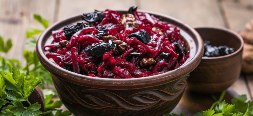 Такой объеденный салат прекрасно подойдёт к семейному ужину, и даже к праздничному столу! Нам понадобится: Свекла Грецкие орехи Чернослив Чеснок Майонез