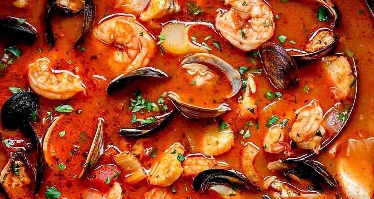 Нарежьте вкусный хлеб на закваске, смажьте оливковым маслом и обжарьте на сковороде. Таким хлебом вкусно вымакивать соус. Морепродукты в томатном соусе