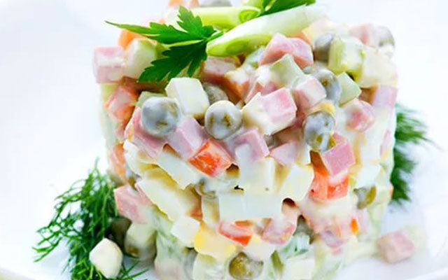 Салат Оливье, вкусный домашний рецепт Самый популярный салат в необычной подаче. Салат—желе Оливье. Обед безбрачия. Салат Оливье