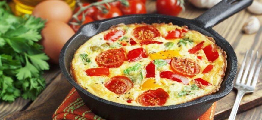 Авторский омлет с «ароматом борща» не похож ни на один традиционный омлет. Все дело в ингредиентах: яйца жарятся вместе с капустой, а соус из свежих томатов