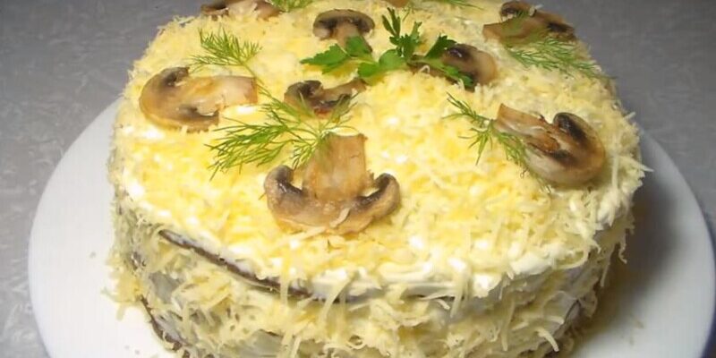 Рецепт вкусного закусочного пирога с начинкой. Коржи готовим из печени, можно взять куриную или любую другую. Для начинки используем жареные грибы с луком