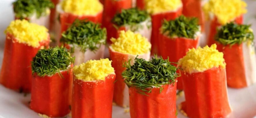 Готовим оригинальную закуску для праздничного стола. Из крабовых палочек создаем небольшие рулетики в виде роллов. Для начинки используем свежий огурец