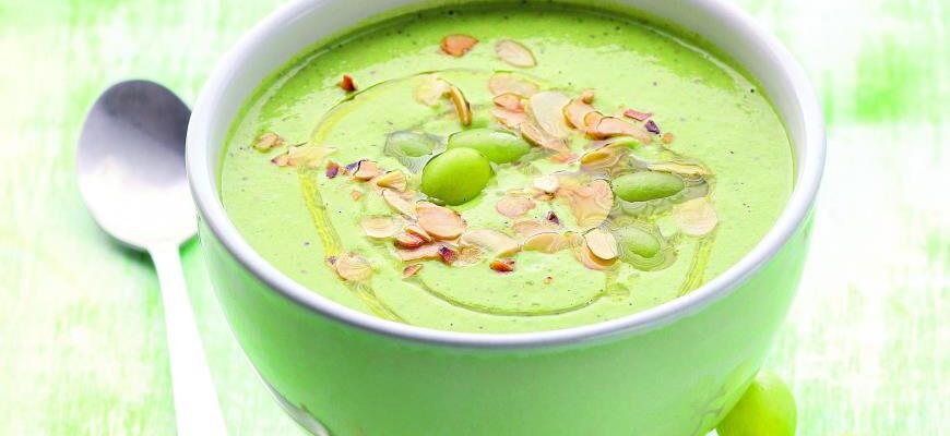 Это конечно же не традиционный гаспачо, но для жарких дней очень хорош. Для приготовления 6 порций нужно: 500 г белого винограда без косточек 4 средних