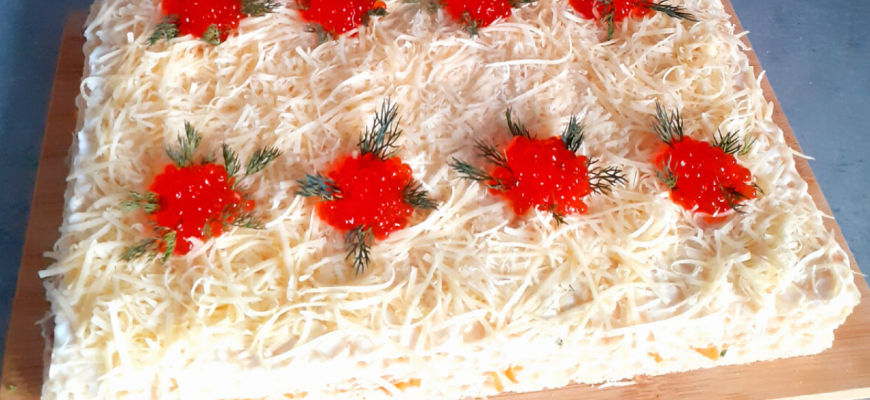 Закуска по этому рецепту получается красивой, нежной и сытной! Такой закусочный тортик никого не оставит равнодушным, он получается очень вкусным!