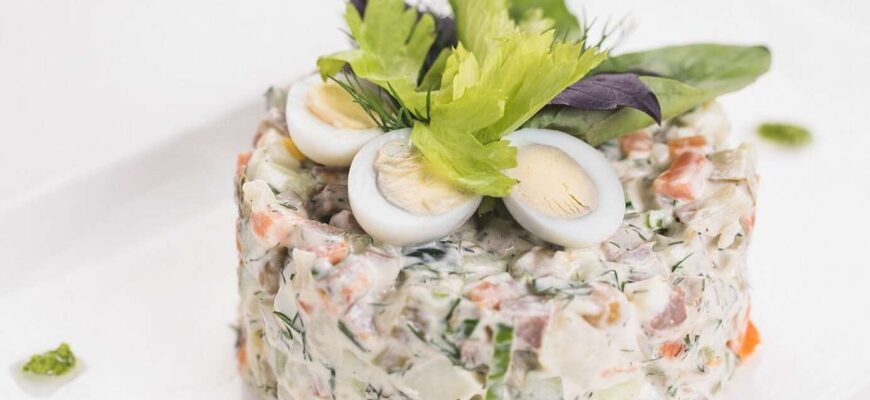 Рецепт «Оливье» с мясом покорит вкусы тех, кто готовит этот популярный салат с колбасой. Мясо добавляет более выраженный вкус, делает салат более сытным.