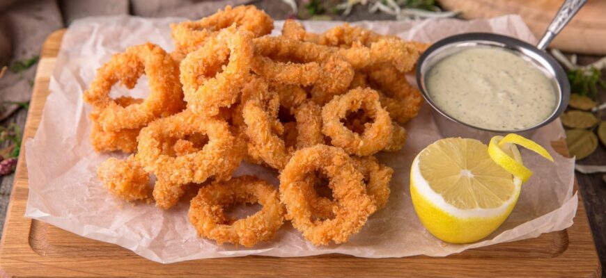 Кольца кальмара в хрустящей панировке — это популярная закуска, которую любят за нежное мясо внутри и золотистую, хрустящую корочку снаружи.