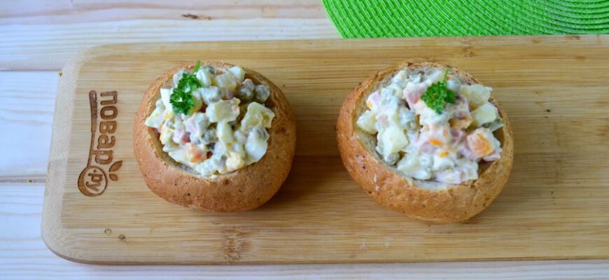 Если привычные салаты в тарелке кажутся тебе скучными — попробуй подать их в съедобной «таре». Салат в булочке — это одновременно закуска и основа для подачи.