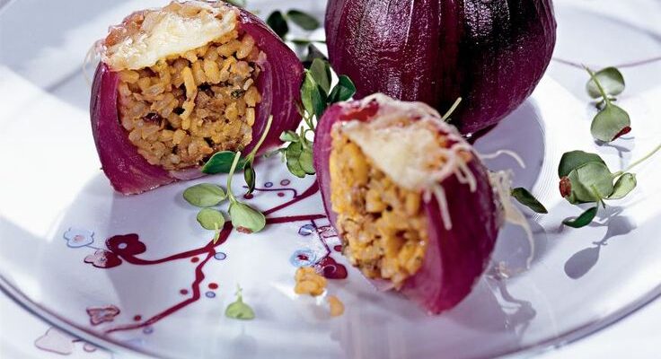 Сложность: средняя Время приготовления: 45 минут Порций: 4 Калорийность: ~120 ккал на 100 г Фаршированный красный лук — это изысканная закуска, которая