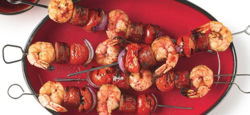 Сложность: легко Время приготовления: 30 минут (без маринования) Порций: 4 Калорийность: ~210 ккал на 100 г Шашлычки — это не только про мясо.