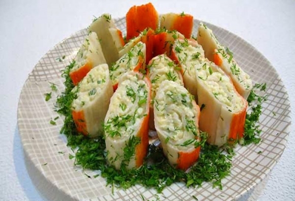 Интересная закуска получается из крабовых палочек, фаршированных рисом. Готовить несложно и съедается быстро. Все будут просить ваш рецепт, чтобы повторить сей закусочный шедевр. Но прежде чем это произойдет, необходимо научиться готовить. Список продуктов для приготовления крабовых палочек с рисом: