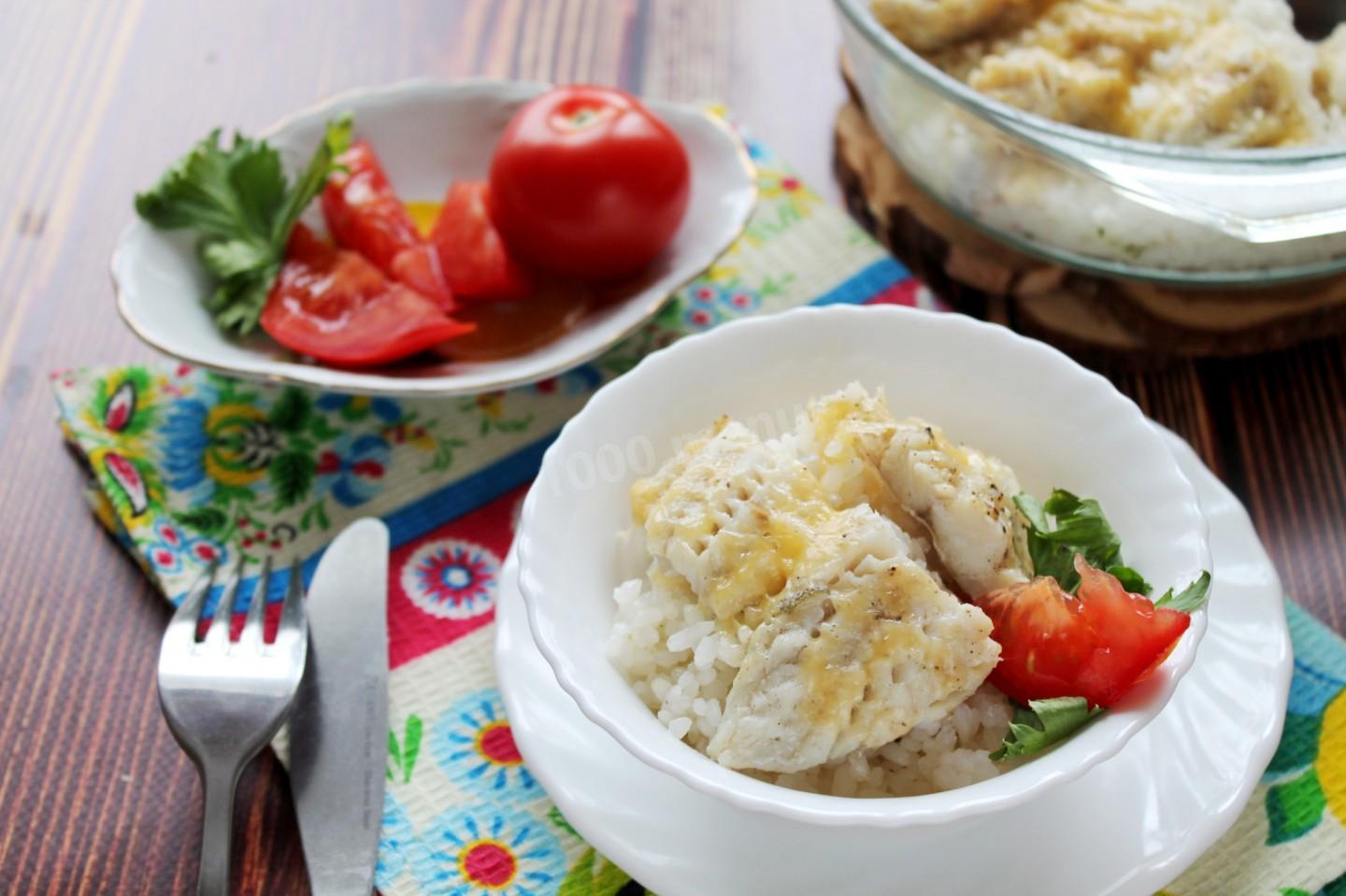 Выложите промаринованные кусочки минтая поверх риса, сбрызните еще маслом
