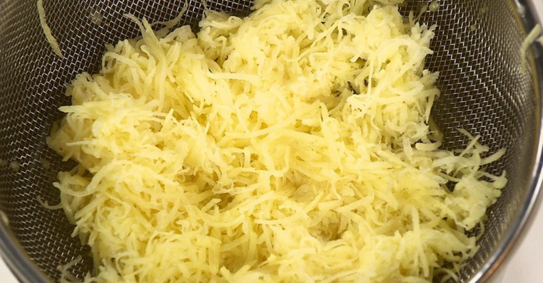 Картофель натираю на крупной терке (можно на мелкой), и,обязательно промываю холодной водой — до прозрачной воды! Делается это для того,чтобы убрать лишний крахмал, в результате картофель не потемнеет-блюдо будет красивого цвета и с хрустящей корочкой.