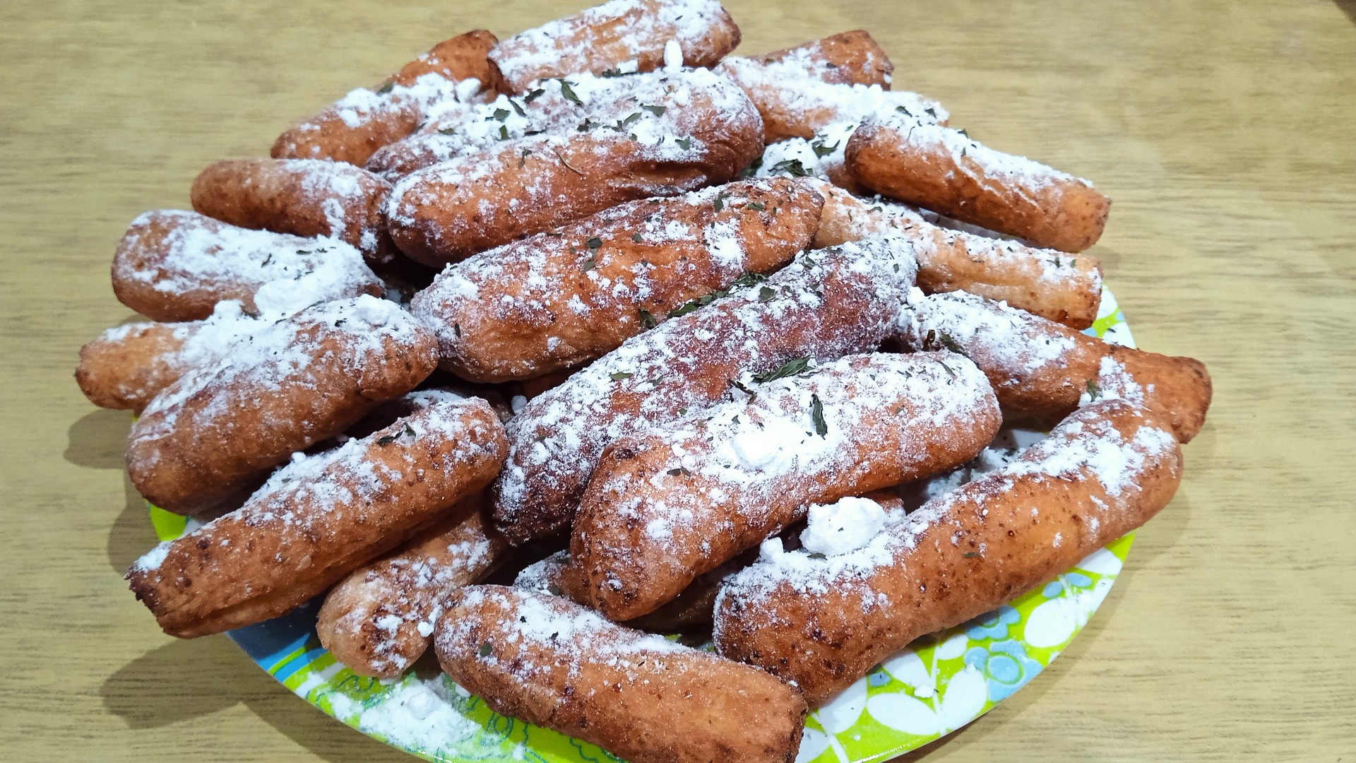5.Для того, чтобы убрать лишнее масло, сначала выложить палочки на салфетки или бумажное полотенце, а затем уже на тарелку, посыпав сахарной пудрой.